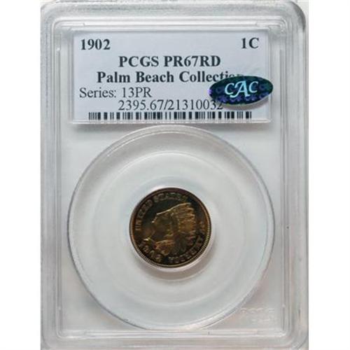 <B>1902 1C PR67 Red PCGS. CAC.</B></I> Ex: Palm Beach Collection. A glorious Superb Gem that showcases intense mirrored brilliance under a colorful array of orange, rose, and olive iridescence. One of the prettier 1902 proof Indians we have ever seen, and only a fleck or two from perfection. Population: 7 in 67 Red, 2 finer (11/07).<BR><I>Ex: FUN Signature (Heritage, 1/04), lot 4414, which realized $5,462.50.<BR>From The Madison Collection.</B></I><BR><BR><B>Coin Engraver:</B> James B. Longacre<BR><BR><b>Shipping:</b> Coins & Currency (<a target="_blank" href="http://www.heritageauctions.com/common/shipping.php">view shipping information</a>)