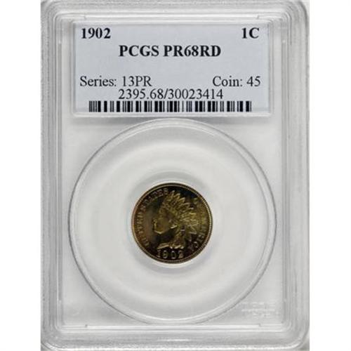 <B>1902 1C PR68 Red PCGS.</B></I> The proof Indian cent series, while eminently collectible in near-Gem and even Gem grades, poses a significant challenge any finer. Examples in PR66 with any color designation appear sporadically, and a move to Superb Gem only exacerbates this trend. Moving to an even more rarefied stratum, PCGS has awarded just nine Indian cents across <I>all</B></I> dates a PR68 grade, with the majority of them Red and Brown. This representative is one of only two pieces certified by PCGS as PR68 Red; coincidentally, both are from 1902 (10/07).<BR> A specimen of extraordinary quality, this lovely early 20th century piece offers exquisite detail and gleaming fields. The surfaces, predominantly copper-orange with a hint of emerald, are virtually unimprovable; even under magnification, the coin's preservation borders on flawless. Captivating and spectacular, an incredible prize for the series enthusiast.<BR><BR><B>Coin Engraver:</B> James B. Longacre<BR><BR><b>Shipping:</b> Coins & Currency (<a target="_blank" href="http://www.heritageauctions.com/common/shipping.php">view shipping information</a>)