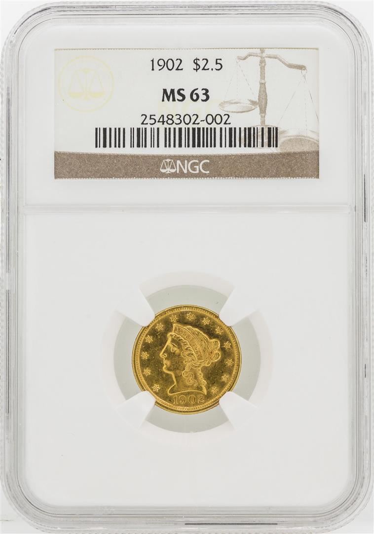 One 1902 $2 1/2 Liberty Head Quarter Eagle Gold Coin NGC MS63. NGC Certified.