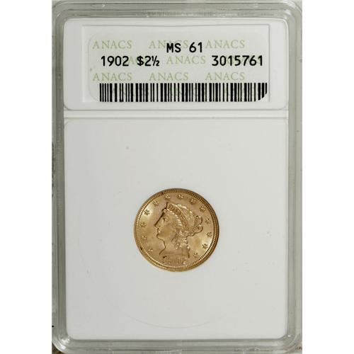 <B>1902 $2 1/2 MS61 ANACS.</B></I> NGC Census: (223/1988). PCGS Population (187/2221). Mintage: 133,500. Numismedia Wsl. Price: $325. (#7854)<BR><BR><b>Shipping:</b> Coins & Currency (<a target="_blank" href="http://www.heritageauctions.com/common/shipping.php">view shipping information</a>)