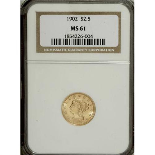 <B>1902 $2 1/2 MS61 NGC.</B></I> NGC Census: (227/2012). PCGS Population (189/2227). Mintage: 133,500. Numismedia Wsl. Price for NGC/PCGS coin in MS61: $310. (#7854)<BR><BR><b>Shipping:</b> Coins & Currency (<a target="_blank" href="http://www.heritageauctions.com/common/shipping.php">view shipping information</a>)