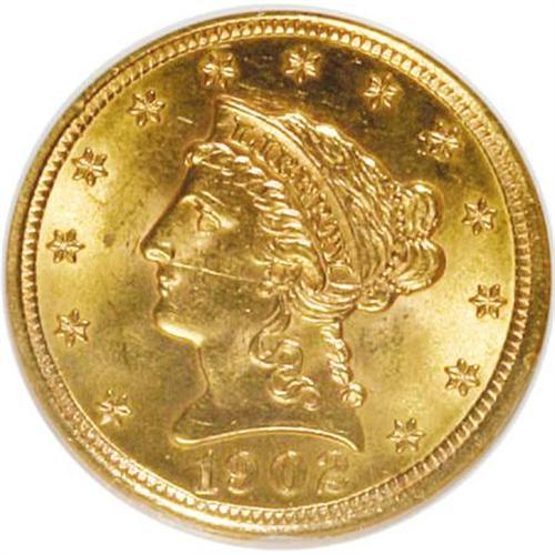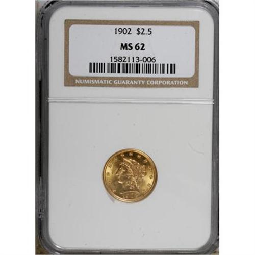 <B>1902 $2 1/2 MS62 NGC.</B></I> NGC Census: (596/1425). PCGS Population (586/1666). Mintage: 133,500. Numismedia Wsl. Price for NGC/PCGS coin in MS62: $455. (#7854)<BR><BR><B>Coin Engraver:</B> Christian Gobrecht<BR><BR><b>Shipping:</b> Coins & Currency (<a target="_blank" href="http://www.heritageauctions.com/common/shipping.php">view shipping information</a>\)