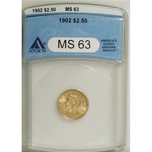 <B>1902 $2 1/2 MS63 ANACS.</B></I> NGC Census: (980/1830). PCGS Population (744/903). Mintage: 133,500. Numismedia Wsl. Price for NGC/PCGS coin in MS63: $825. (#7854)<BR><BR><b>Shipping:</b> Coins & Currency (<a target="_blank" href="http://www.heritageauctions.com/common/shipping.php">view shipping information</a>)