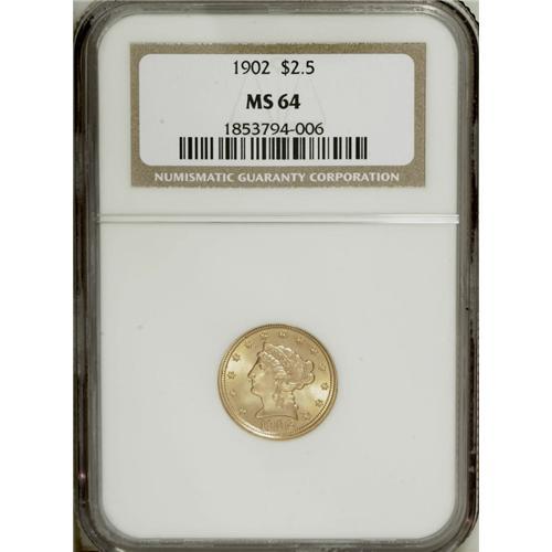 <B>1902 $2 1/2 MS64 NGC.</B></I> A suitably impressed and rather frosty piece that has considerable eye appeal. A few scattered marks are noted on the devices, and a small copper spot is noted below Liberty's nose.<BR><BR><b>Shipping:</b> Coin/Currency (<a target="_blank" href="http://www.heritageauctions.com/common/shipping.php">view shipping information</a>)