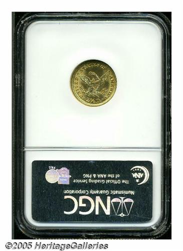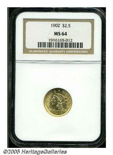<B>1902<$2 1/2> MS64 NGC.</B></I> Bright yellow-gold surfaces display radiant luster and sharply defined motifs. A few trivial marks on Liberty's cheek and chin and in the upper reverse field limit the grade. This coin has considerable snap and eye appeal.