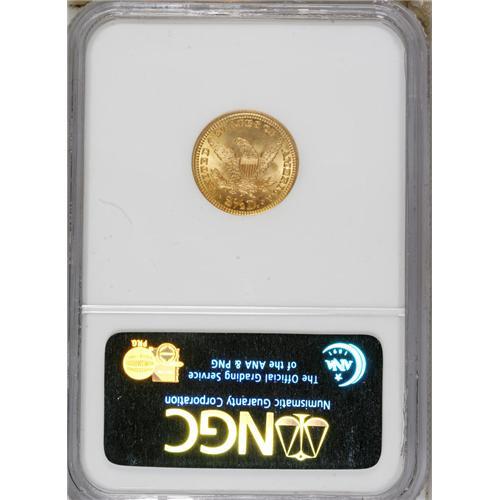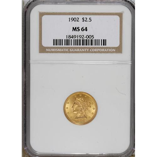 <B>1902 $2 1/2 MS64 NGC.</B></I> Highly lustrous with a vibrant, satiny appearance and lovely yellow-gold toning. A wispy luster graze in the right obverse field and several tick marks on Liberty's cheek are seemingly all that prevent a Gem assessment. High end for the grade and ideal for a type set.<BR><BR><b>Shipping:</b> Coins & Currency (<a target="_blank" href="http://www.heritageauctions.com/common/shipping.php">view shipping information</a>)