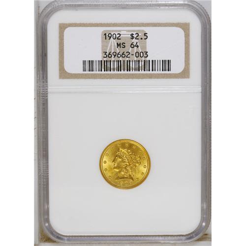 <B>1902 $2 1/2 MS64 NGC.</B></I> The glittering, splendidly lustrous peach-gold and lime-green surfaces possess the instant eye appeal of a Gem. Sharply struck with just a few wispy marks on each side, almost all of which are located in the fields. Premium quality for the MS64 grade level.<BR><BR><b>Shipping:</b> Coin/Currency (<a target="_blank" href="http://www.heritageauctions.com/common/shipping.php">view shipping information</a>)