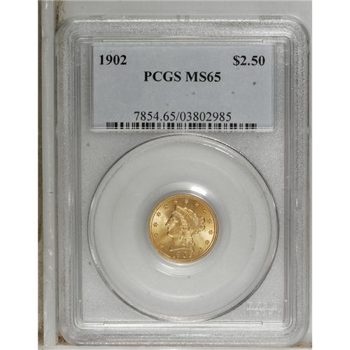 <B>1902 $2 1/2 MS65 PCGS.</B></I> This issue had the first six-figure mintage for a quarter eagle since 1878. This delightful Gem exhibits lovely luster and carefully preserved yellow-gold surfaces with hints of wheat and apricot.<BR><BR><b>Shipping:</b> Coins & Currency (<a target="_blank" href="http://www.heritageauctions.com/common/shipping.php">view shipping information</a>)