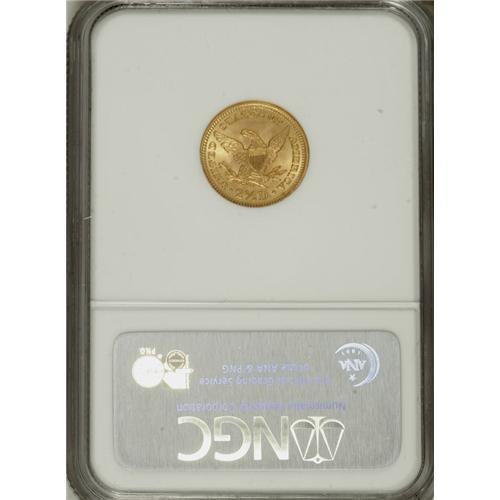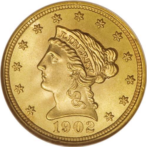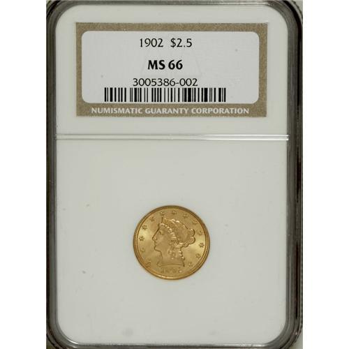 <B>1902 $2 1/2 MS66 NGC.</B></I> This beautiful example of an available type coin issue shows a full strike and only the most trivial abrasions on the apricot-gold surfaces. The generous mintage and good subsequent survival rates ensure a plentiful supply today in all grades up through MS67, with even a handful of pieces graded MS68. NGC has certified 42 coins finer (4/07).<BR><BR><b>Shipping:</b> Coins & Currency (<a target="_blank" href="http://www.heritageauctions.com/common/shipping.php">view shipping information</a>)