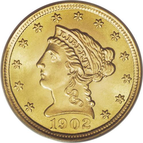 <B>1902 $2 1/2 MS66 PCGS.</B></I> A sharp strike and brilliant yellow-gold luster are the hallmarks of this frosty Premium Gem. It is an exceptional example that is seldom exceeded for quality. Population: 93 in 66, 22 finer (2/07).<BR><I>Ex: Bowers and Ruddy Galleries, Inc., circa 1978.</B></I><BR><BR><b>Shipping:</b> Coins & Currency (<a target="_blank" href="http://www.heritageauctions.com/common/shipping.php">view shipping information</a>)