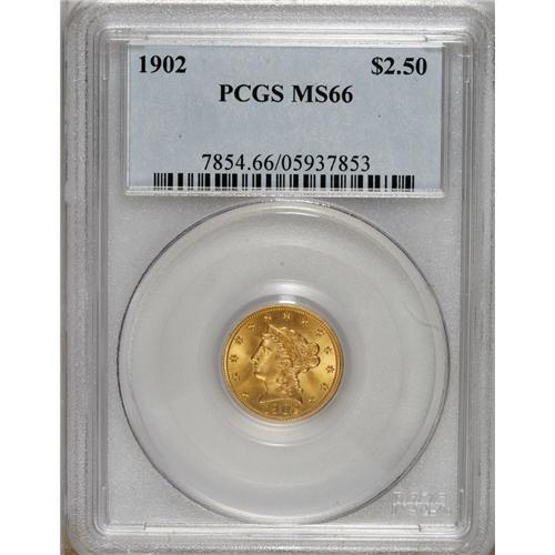 <B>1902 $2 1/2 MS66 PCGS.</B></I> An attractive Premium Gem representative of this early 20th century issue, decisively struck with subtle, frosty luster and carefully struck amber-honey fields. A delightful example that could find a place in a high-end type or date set.<BR><BR><b>Shipping:</b> Coins & Currency (<a target="_blank" href="http://www.heritageauctions.com/common/shipping.php">view shipping information</a>)