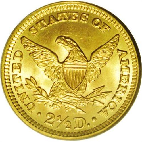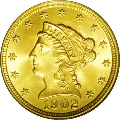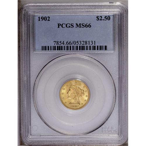 <B>1902<$2 1/2> MS66 PCGS.</B></I> Sharply struck and lightly toned with satiny, green-gold surfaces, essentially pristine except for a tiny tick mark in the left obverse field between Liberty's nose and star 4. Exceptional eye appeal. Population: 81 in 66, 17 finer (4/06).