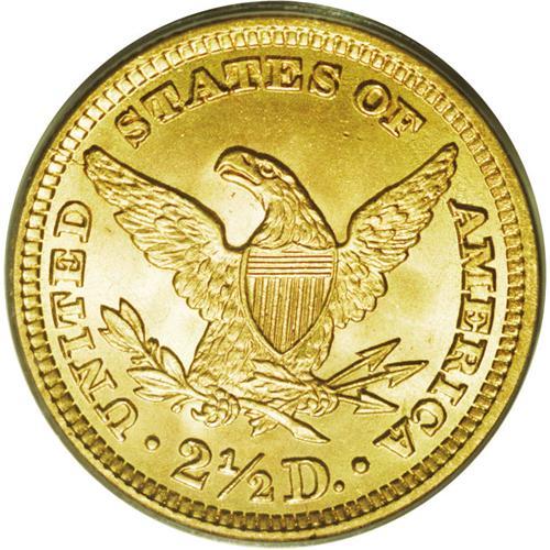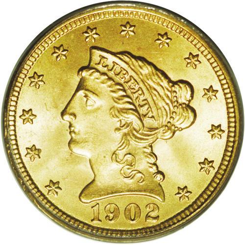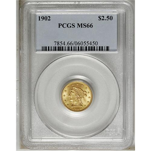 <B>1902<$2 1/2> MS66 PCGS.</B></I> Though small by contemporary standards, its mintage of 133,500 business strikes puts this issue into the "type coin" category. This charming example would certainly make an excellent addition to a type set. Highly lustrous and sharply struck, its well-preserved surfaces are yellow-gold with traces of orange and peach.