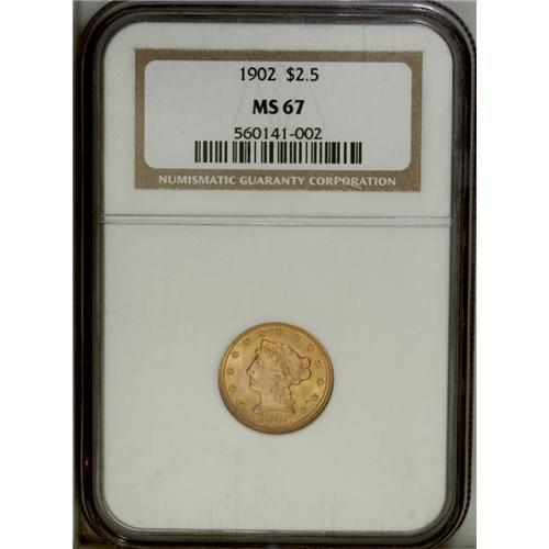 <B>1902 $2 1/2 MS67 NGC.</B></I> A lush and lustrous orange-gold colored Gem. The striking details are all crisp with no die clashing or planchet defects. The satiny luster is evenly distributed across both sides. A popular coin and this is an unimpeachable Superb Gem. Census: 36 in 67, 4 finer (10/06).<BR><BR><b>Shipping:</b> Coin/Currency (<a target="_blank" href="http://www.heritageauctions.com/common/shipping.php">view shipping information</a>)
