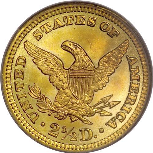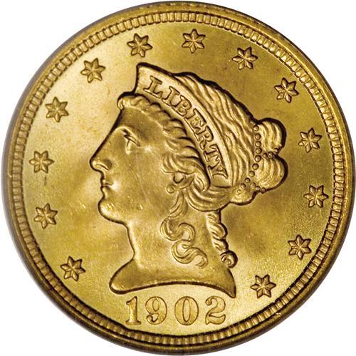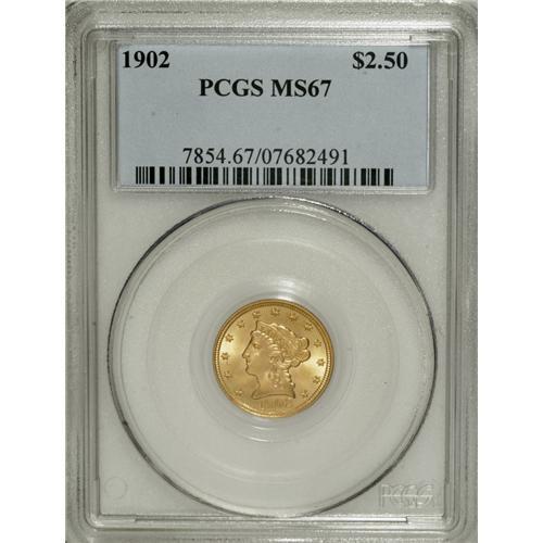 <B>1902 $2 1/2 MS67 PCGS.</B></I> A Superb Gem with frosty surfaces and brilliant yellow luster. The reverse has considerable deep orange toning to further improve the overall eye appeal. The strike is penetrating, and the lustrous surfaces have minimal imperfections. Population: 22 in 67, 0 finer (2/07).<BR><BR><b>Shipping:</b> Coins & Currency (<a target="_blank" href="http://www.heritageauctions.com/common/shipping.php">view shipping information</a>)