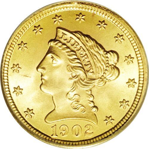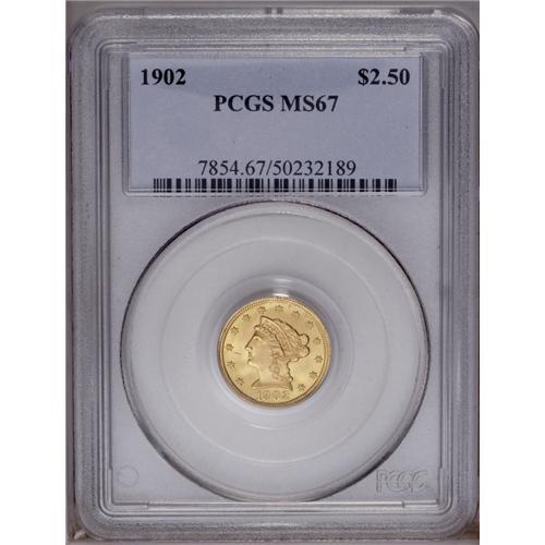 <B>1902<$2 1/2> MS67 PCGS.</B></I> This fully struck Superb Gem exhibits vivacious cartwheel sheen, and has only trivial contact in the fields. Lime and apricot hues are comprehensive, save for a thin wisp of charcoal in the left obverse field. Suitable for the finest quality gold type set. Population: 16 in 67, 0 finer (1/06).