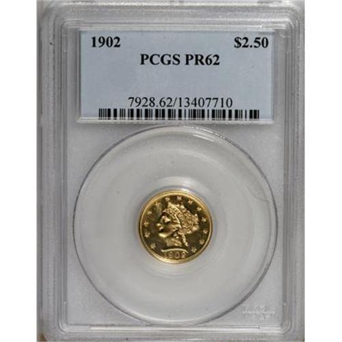 <B>1902 $2 1/2 PR62 PCGS.</B></I> Only 193 proofs were struck of the 1902 quarter eagle. If one can estimate survivorship from the number certified (always a tricky proposition), most of those coins are still extant. This coin is typical of proofs struck from 1902-1904; that is, they were produced with no (or little) contrast between the fields and devices. This piece actually does show a faint bit of contrast on the reverse. The surfaces are bright and light hairlines account for the grade.<BR><BR><B>Coin Engraver:</B> Christian Gobrecht<BR><BR><b>Shipping:</b> Coins & Currency (<a target="_blank" href="http://www.heritageauctions.com/common/shipping.php">view shipping information</a>)