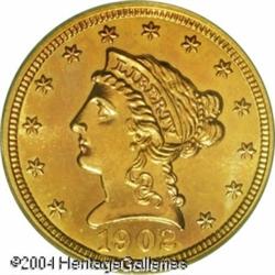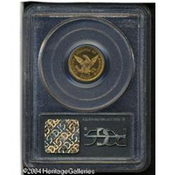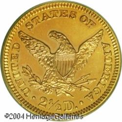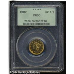 1902 $2 1/2 PR66 PCGS. Only 193 proofs were produc <B>1902 $2 1/2 PR66 PCGS.</B></I> Only 193 proofs were produced of the 1902 quarter eagle, and of that number probably fewer than half are extant today as recognizable proof strikings. This was also the first year of the all-brilliant method of proofing with the devices equally as brilliant as the fields. This is a particularly well preserved example, and it is very rare as such with only four pieces graded PR66 by PCGS and an equal number by NGC with five pieces finer (10/04). The surfaces have a deep reddish-golden patina that is most attractive, and overall the coin is well balanced on both obverse and reverse. <BR><BR><B>Important notice:</B> Heritage usually auctions material at the rate of 200-250 lots per hour. On some occasions eBay Live bid software or the Internet may not be able to keep up with the pace of the auction. We recommend placing a realistic absentee bid now as insurance to avoid disappointment. Occasionally the auctioneer may eliminate or reject an eBay Live bid, and the auctioneer may also reopen a lot after the close of the eBay live bidding (usually because we missed an audience bid), and may reject your bid even if it shows you as the winning bidder. By bidding via eBay Live, you agree that Heritage may award the lot to another bidder at its sole discretion under the circumstances described above or any other reasonable circumstances. Since eBay bids are not shown to us until we open the lot on the floor, we treat those bids just like floor bids. In most cases the floor responds before the eBay bid is presented to us, due to Internet lag time, so for consistency we have made it a policy that floor bids are always considered first over tie eBay live bids. Also please note that all Heritage lots purchased through eBay Live carry a 20% Buyer's Premium. Please make sure you read the Terms and Conditions before you bid. This lot is being auctioned in conjunction with a live floor auction by Heritage Galleries & Auctioneers. All final auction and invoice information will be supplied by Heritage Galleries & Auctioneers, and all other information should be considered preliminary. Lot:6536