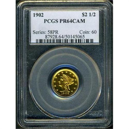 <b>1902 $2.50 Liberty. PCGS graded PF64 CAM.</b> Pop: 1/2. First year of the "all-brilliant," finish without contrast between the devices and fields; this method of striking proofs semi-brilliant devices that shine with almost the same concentration of gold mirrors as the reflective fields. Both sides are honeycombed in warm golden reds with a nice original patina. Hairlines are faintly visible, but show minimum distraction. One of 193 Proofs minted.