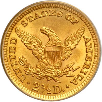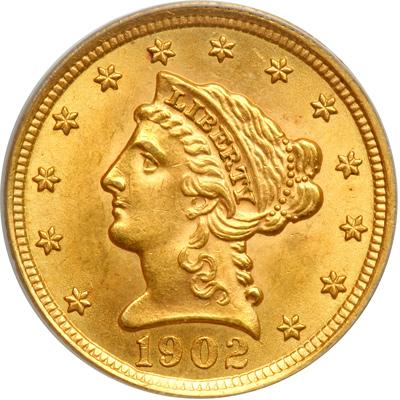 1902 $2.50 Liberty. PCGS graded MS-63. A very choice example with hints of natural golden toning. Small mark at Liberty's lip (PCGS # 7854).