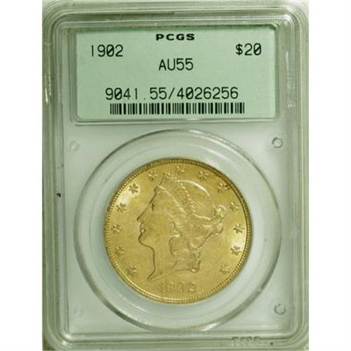 <B>1902 $20 AU55 PCGS.</B></I> PCGS Population (39/374). NGC Census: (17/354). Mintage: 31,140. Numismedia Wsl. Price for NGC/PCGS coin in AU55: $688. (#9041)<BR><BR><b>Shipping:</b> Coins & Currency (<a target="_blank" href="http://www.heritageauctions.com/common/shipping.php">view shipping information</a>)