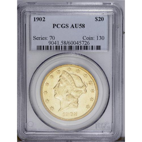 <B>1902<$20> AU58 PCGS.</B></I> The mint luster is virtually complete, and the strike is very good. Lightly abraded, but with much better eye appeal than most examples in this grade. The 1902 had the lowest mintage of any 20th century Liberty double eagle, with a production of only 31,254 pieces.<BR><I>From The Steve Glenn Collection.</B></I> <BR><BR><B>Important notice:</B> Heritage usually auctions material at the rate of 200-250 lots per hour. On some occasions eBay Live bid software or the Internet may not be able to keep up with the pace of the auction. We recommend placing a realistic absentee bid now as insurance to avoid disappointment. Occasionally the auctioneer may eliminate or reject an eBay Live bid, and the auctioneer may also reopen a lot after the close of the eBay live bidding (usually because we missed an audience bid), and may reject your bid even if it shows you as the winning bidder. By bidding via eBay Live, you agree that Heritage may award the lot to another bidder at its sole discretion under the circumstances described above or any other reasonable circumstances. Since eBay bids are not shown to us until we open the lot on the floor, we treat those bids just like floor bids. In most cases the floor responds before the eBay bid is presented to us, due to Internet lag time, so for consistency we have made it a policy that floor bids are always considered first over tie eBay live bids. Also please note that all Heritage lots purchased through eBay Live carry a 20% Buyer's Premium. Please make sure you read the Terms and Conditions before you bid. This lot is being auctioned in conjunction with a live floor auction by Heritage Galleries & Auctioneers. All final auction and invoice information will be supplied by Heritage Galleries & Auctioneers, and all other information should be considered preliminary. Lot:4411 <BR><BR><B>Winning Notification and Billing:</B> After the FINAL session in this auction is complete, Heritage will send e-mail and snail mail invoices. This process normally takes several days. All final auction and invoice information will be supplied by Heritage Galleries & Auctioneers, and all other information should be considered preliminary. <BR><BR>This auction will be conducted on a live auction floor and over the Internet through eBay Live. If you choose to place an absentee bid, please take a moment to <font color='#0000ff'><u><a href='http://pages.ebay.com/liveauctions/help/before/laabsentee.html'>learn how eBay Live absentee bidding works</a></u></font><font color='#000000'>