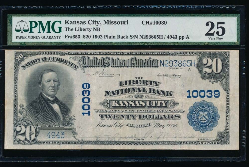 One 1902 $20 Kansas City National Bank Note PMG 25.