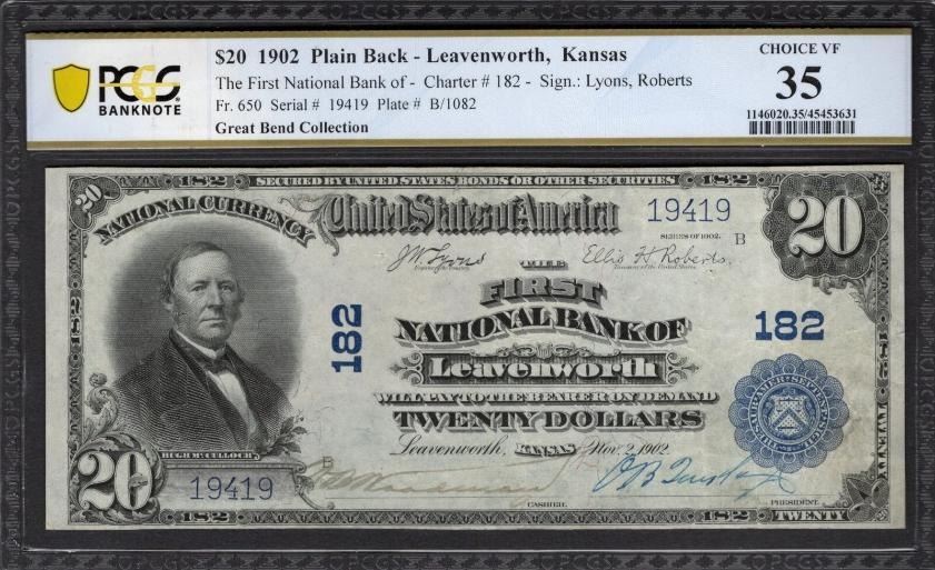 One 1902 $20 Leavenworth KS National PCGS 35.