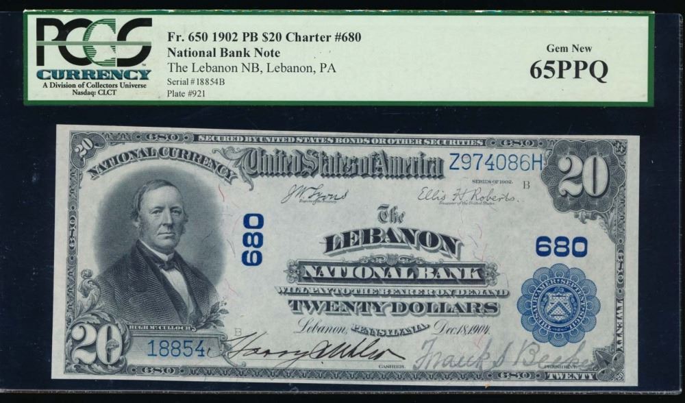 One 1902 $20 Lebanon National Bank Note PCGS 65PPQ.
