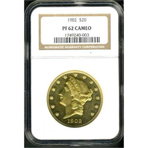 <b>1902 $20 Liberty. NGC graded PF62 CAM.</b> Pop: 1/4. Nice light cameo effect. This is a well struck double eagle Proof that has a few small marks that are all but unnoticeable without long study. Full stars and other design elements, since Proofs are, as a rule crisply made by the Mint and, as a rule, carefully preserved by their owners. This coin is now four years into its second century and should continue to give years of pleasure and visual satisfaction to the next owner. One of a mere 114 pieces struck in Proof in 1902.