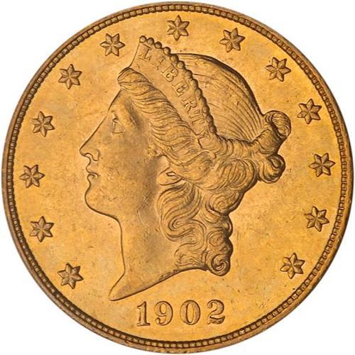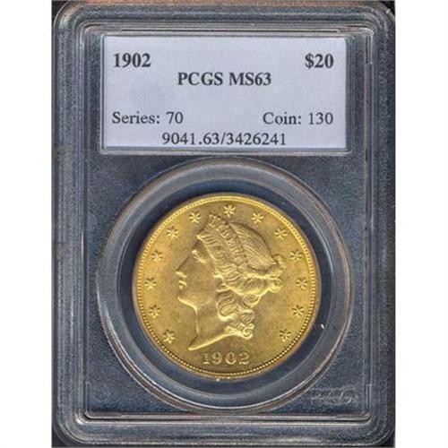 <b>1902 $20 Liberty. PCGS graded MS63.</b> 31,140 mintage. A blazing beauty of a coin and one of the most difficult 20th century Philadelphia Mint Liberty $20s to find nice! The satiny to semi-prooflike surfaces are afire with bright volatile cartwheel luster that looks as though it would like nothing better than to explode off the surface and into your eyes. Well struck for the date and easily matching or surpassing others in this very choice grade. Liberty's features are especially clean and choice.