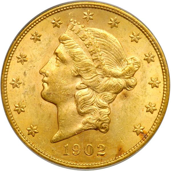 1902 $20 Liberty. PCGS graded MS-62. Nice original gold toning. 31,140 pieces struck of this desirable low-mintage date. Choice frosty luster. Pop 153; 73 finer (PCGS # 9041) .