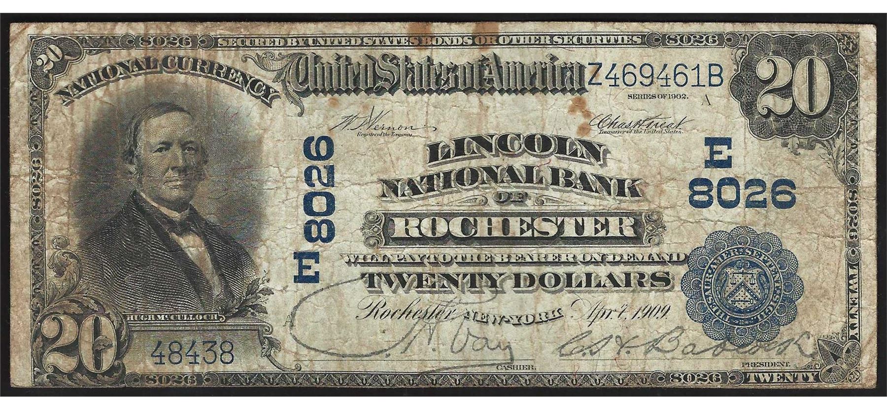 One 1902 $20 Lincoln National Bank of Rochester National Currency Note CH# 8026.