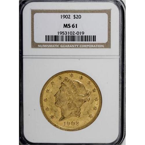 <B>1902 $20 MS61 NGC.</B></I> An unworn example of this lower-mintage 20th century double eagle issue, which has an original mintage of just 31,140 pieces. Light to moderate abrasions affect the strongly lustrous orange-gold surfaces, which display a hint of reflectivity.<BR><BR><B>Coin Engraver:</B> James B. Longacre<BR><BR><b>Shipping:</b> Coins & Currency (<a target="_blank" href="http://www.heritageauctions.com/common/shipping.php">view shipping information</a>\)