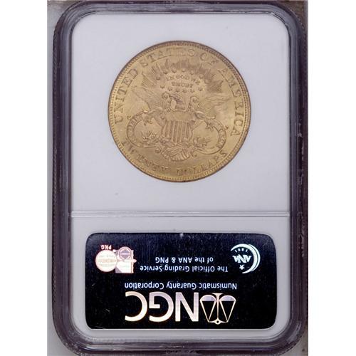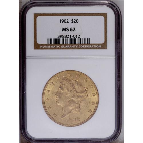 <B>1902 $20 MS62 NGC.</B></I> Apricot-gold surfaces display numerous small abrasions that interfere minimally with the coin's luster flow. The design elements are sharply struck throughout.