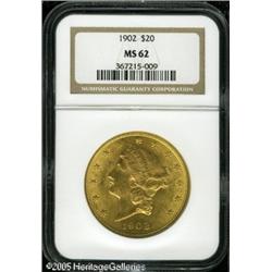 <B>1902 $20 MS62 NGC.</B></I> Original green-gold surfaces, with excellent sharpness overall and most of the grade-limiting abrasions found on the obverse. Uncirculated examples of this low mintage Philadelphia Twenty are usually average quality at best.<BR><I>From The Richard J. Chouinard Collection of United States Coins, Part Two.</B></I> Lot:9312