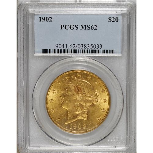 <B>1902 $20 MS62 PCGS.</B></I> Lustrous and generally clean with a few tiny ticks on the cheek and a subtle alloy spot near the R in LIBERTY. The 1902 has a low mintage of 31,140 pieces, and past knowledgeable collectors have accumulated Mint State examples in the place of slightly finer common dates.<BR><BR><b>Shipping:</b> Coins & Currency (<a target="_blank" href="http://www.heritageauctions.com/common/shipping.php">view shipping information</a>)
