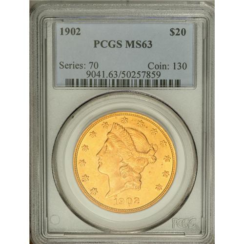 <B>1902 $20 MS63 PCGS.</B></I> This low mintage issue is scarce at all grade levels, very challenging in Select Mint State, and rare any finer. The essentially full striking details exhibited by the current example are its most noteworthy feature. It is also nicely preserved and highly lustrous, with bright lime-gold toning. A significant opportunity for the specialist in Liberty Head double eagles. Population: 59 in 63, 8 finer (11/06).<BR><I>From The Kutasi Collection.</B></I><BR><BR><b>Shipping:</b> Coin/Currency (<a target="_blank" href="http://www.heritageauctions.com/common/shipping.php">view shipping information</a>)