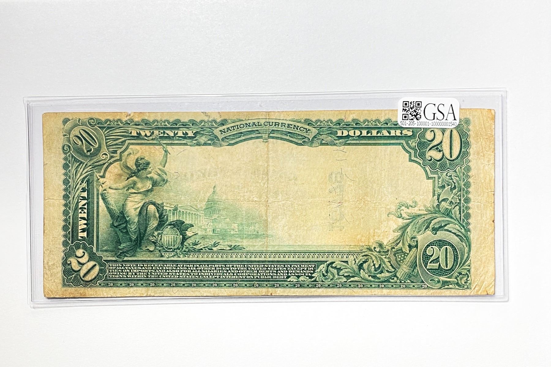 f. Notes sold referencing a third-party grading service are sold “AS IS” without any express or implied warranty, except for guarantee by GSA that they are genuine. Grading, condition or other attributes of any Product may have a material effect on its value and the opinion of others, including third-party grading services such as PCGS Currency and PMG may differ with that of GSA. GSA shall not be bound by any prior or subsequent opinion, determination, or certification by any grading service. Bidders specifically waive any claim to right of return of any Product because of the opinion, determination, or certification, or lack thereof, by any grading service. Certain warranties may be available from the grading services and Bidders are referred to them for further details: Paper Money Guaranty (PMG), PO Box 4711, Sarasota, FL 34230; PCGS Currency, PO Box 10470, Peoria, IL 61612-0470; PCGS Gold Shield, PO Box 9458, Newport Beach, CA 92658. Third-party graded notes are not returnable for any reason whatsoever.