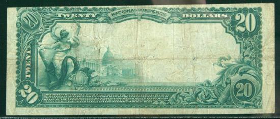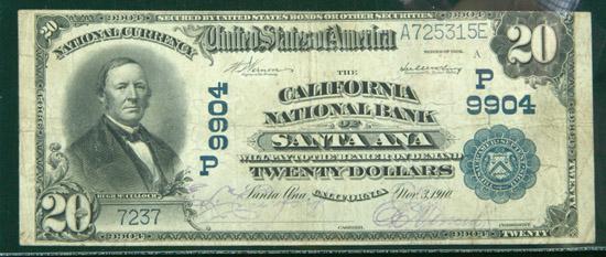 1902, $20 National Bank Note. The California NB, Santa Ana, CA. PCGS Very Fine 20. . Fr-653. Third Charter Date Backs and Plain Backs only from this rare bank, which issued for just a dozen years before liquidating in early 1923. Only six notes are known, a number which has remained unchanged for several years with no new discoveries in the last decade or so. Purple signatures add to the visual appeal of this note that was in both the Charles Colver and the Lowell Horwedel collections. It last sold for a hair over $4,000 when last offered in 2004.