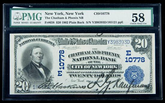 1902, $20 National Bank Note. The Chatham & Phenix NB of the City of New York, NY. PMG Choice About Unc 58. . Fr-658. This pretty note appears Gem at first glance, although doubtless a hidden fold was found by the graders at PMG.