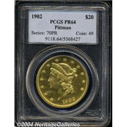 <B>1902<$20> PR64 PCGS.</B></I> Ex: Pittman. This meticulously struck sunrise-gold near-Gem exhibits flashy mirrored fields and has impressive eye appeal. A few wisps of milky gray patina are noted on the reverse, above the I in PLURIBUS and the field near the arrowheads, but there is scant evidence of the wispy hairlines that often accompany proof gold coins. Only 114 proofs were struck, and far fewer than the quantity survive in unimpaired grades. Although the PCGS population for the PR64 grade is 22 pieces, it is very likely that most of that population reflects resubmissions from a dealer or two attempting to achieve the elusive PCGS PR65 grade, which only a solitary example has attained.<BR><I>Ex: John Jay Pittman Collection, Part One (Akers, 10/97), lot 1178; earlier purchased by Pittman from Max L. Justus on 11/22/59 for $945.</B></I> <BR><BR><B>Important notice:</B> Heritage usually auctions material at the rate of 200-250 lots per hour. On some occasions eBay Live bid software or the Internet may not be able to keep up with the pace of the auction. We recommend placing a realistic absentee bid now as insurance to avoid disappointment. Occasionally the auctioneer may eliminate or reject an eBay Live bid, and the auctioneer may also reopen a lot after the close of the eBay live bidding (usually because we missed an audience bid), and may reject your bid even if it shows you as the winning bidder. By bidding via eBay Live, you agree that Heritage may award the lot to another bidder at its sole discretion under the circumstances described above or any other reasonable circumstances. Since eBay bids are not shown to us until we open the lot on the floor, we treat those bids just like floor bids. In most cases the floor responds before the eBay bid is presented to us, due to Internet lag time, so for consistency we have made it a policy that floor bids are always considered first over tie eBay live bids. Also please note that all Heritage lots purchased through eBay Live carry a 20% Buyer's Premium. Please make sure you read the Terms and Conditions before you bid.