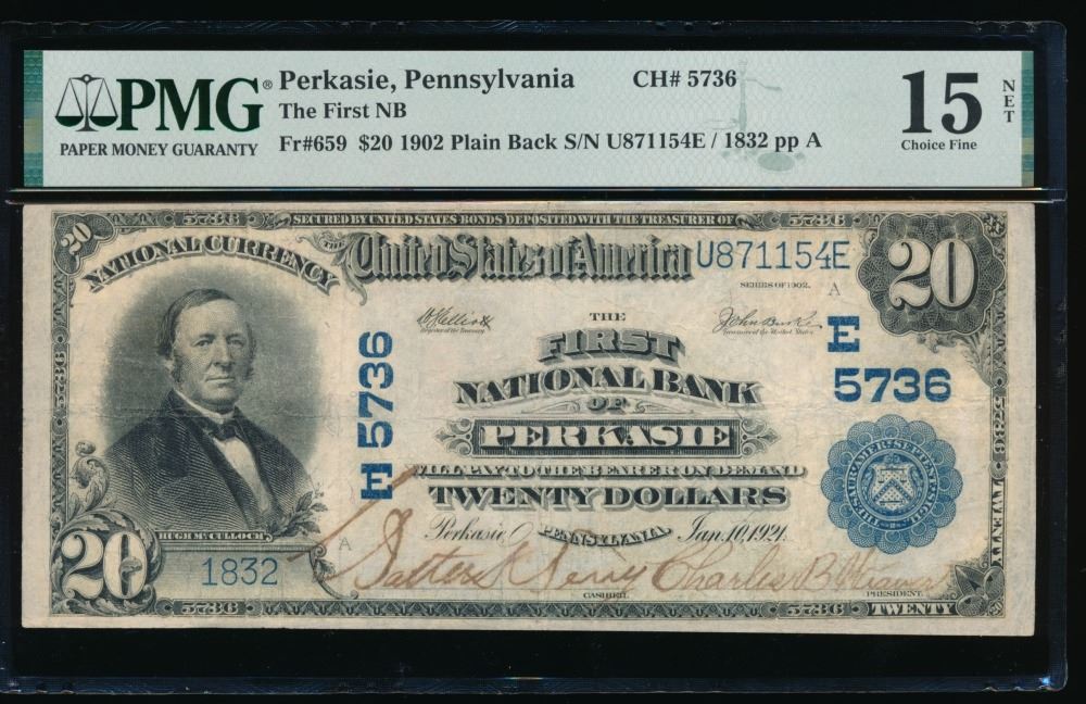 One 1902 $20 Perkasie PA National PMG 15NET.