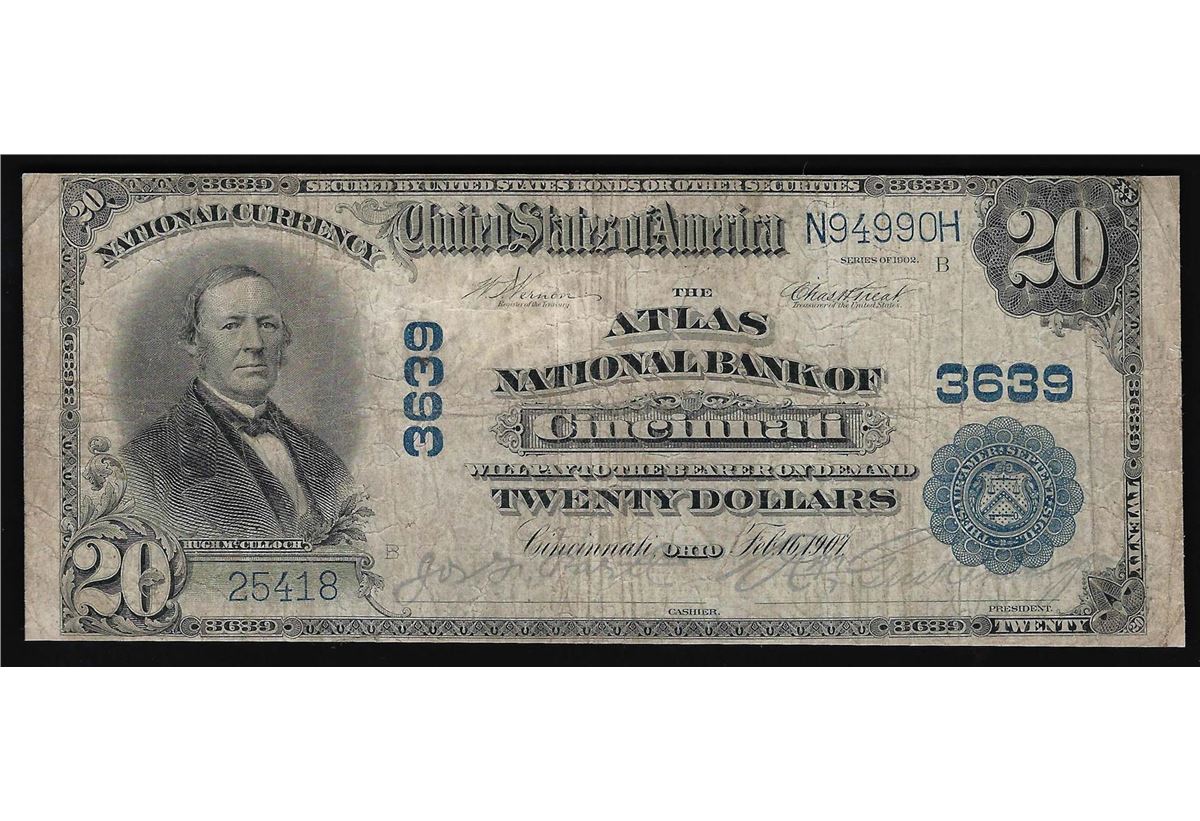 One 1902 $20 The National Bank of Cincinnati Ohio National Currency Note.