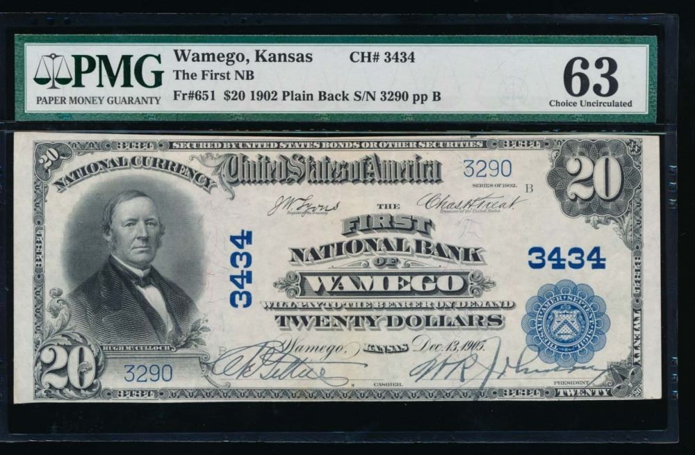 One 1902 $20 Wamego National Bank Note PMG 63.