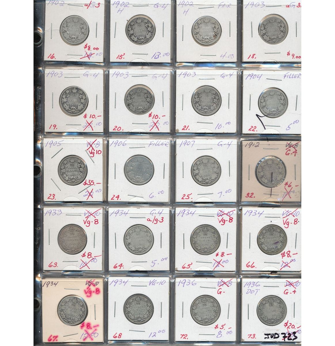 1902 25¢ to 1936 Lot; includes 1902, 1902H(2), 1903(4), 1904, 1905, 1906, 1907, 1908(2), 1909, 1910(2), 1911, 1912(2), 1913, 1914, 1915(4), 1916(2), 1920, 1921(5), 1927(2), 1928(2), 1930(2), 1931, 1933, 1934(5), 1936 & 1936 Dot. A nice lot of 53 coins mainly Good to Fine