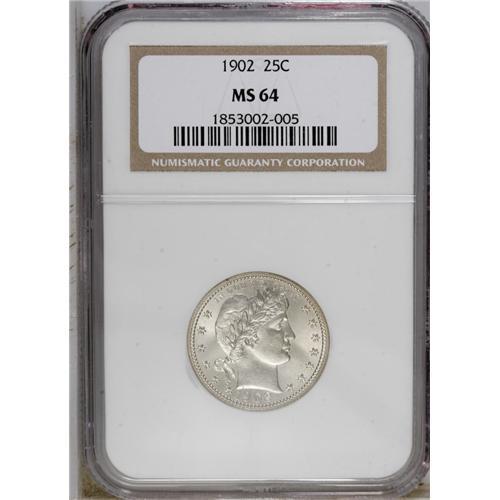 <B>1902 25C MS64 NGC.</B></I> Hints of gold and blue patina enliven the highly lustrous surfaces. Choice and solidly struck with a small abrasion on the reverse shield. Census: 42 in 64, 28 finer (10/06).<BR><BR><b>Shipping:</b> Coin/Currency (<a target="_blank" href="http://www.heritageauctions.com/common/shipping.php">view shipping information</a>)
