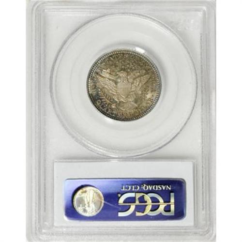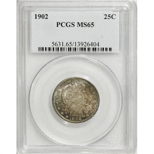 <B>1902 25C MS65 PCGS.</B></I> Dappled blue-green, violet, and gold patina drapes the shining surfaces of this 20th century Barber Gem. Well-defined with impressive visual appeal. Population: 25 in 65, 27 finer (8/07).<BR><BR><B>Coin Engraver:</B> Charles E. Barber<BR><BR><b>Shipping:</b> Coins & Currency (<a target="_blank" href="http://www.heritageauctions.com/common/shipping.php">view shipping information</a>)