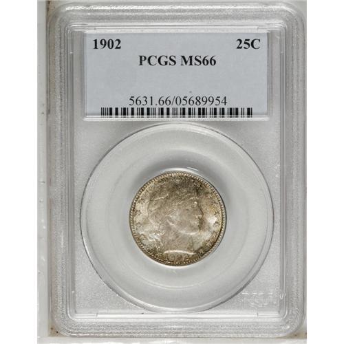 <B>1902<25C> MS66 PCGS.</B></I> This piece has frosty luster accented with speckled olive-green and reddish-gold patina. Sharply struck, with no major marks to report. Population: 29 in 66, 2 finer (7/06).