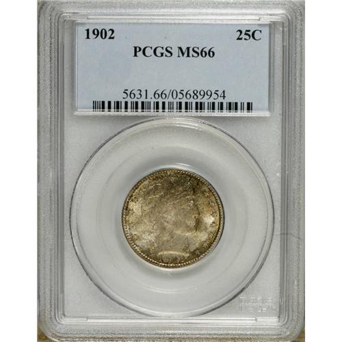 <B>1902 25C MS66 PCGS.</B></I> This piece has frosty luster accented with speckled olive-green and reddish-gold patina. Sharply struck with no major marks to report. Population: 25 in 66, 2 finer (1/07).<BR><BR><b>Shipping:</b> Coins & Currency (<a target="_blank" href="http://www.heritageauctions.com/common/shipping.php">view shipping information</a>)